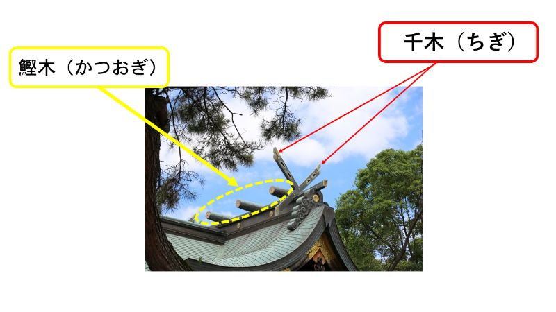 鰹木は古来の建築で用いられていたものですが、本来の役割は葺いた屋根材を守る補強材でした。建築が確立された今となっては、格式を示すためや神社のシンボル的な装飾に変化しております。