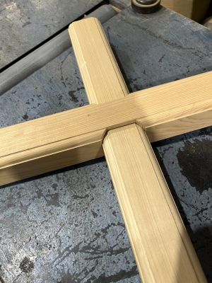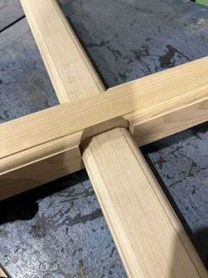 木を格子に組む格天井の仕口は一般的には留にする方法がよく見られますが、今回は大入れにしました。
