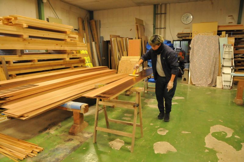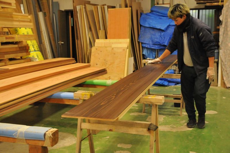 大型の機械音が響く第一工場とは違って、静まり返った第二工場。朝から一人、ひたすら同じ作業を続けている大工がいます。古民家修復で使う外壁の木材に塗装を施す仕事です。木材の長さ分を行ったり来たり何度も往復しています。施主様のご依頼通りの色が出るよう調整しながら重ね塗りを繰り返す作業です。