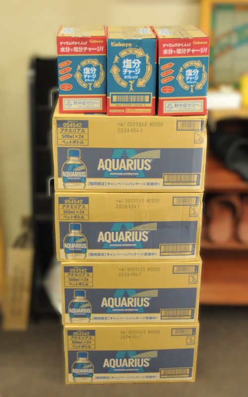夏場は、会社にスポーツドリンクと塩分タブレットを常備しています。休憩所は涼しく保たれ、冷蔵庫には飲み物がたくさん冷やされています。各現場にも塩分タブレットとスポーツドリンクを常備することとし、こまめに水分とミネラルを補給するよう促しています。塩分タブレットとスポーツドリンクは夏の間、会社が補充し続けることになっています。