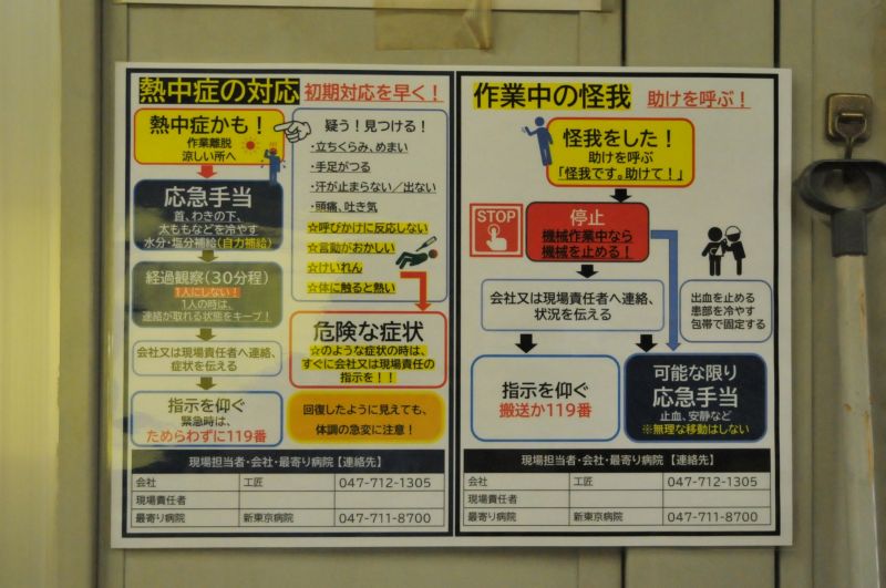 熱中症の早期発見と初期対応手順フローや体制を示したポスターを掲示しました。